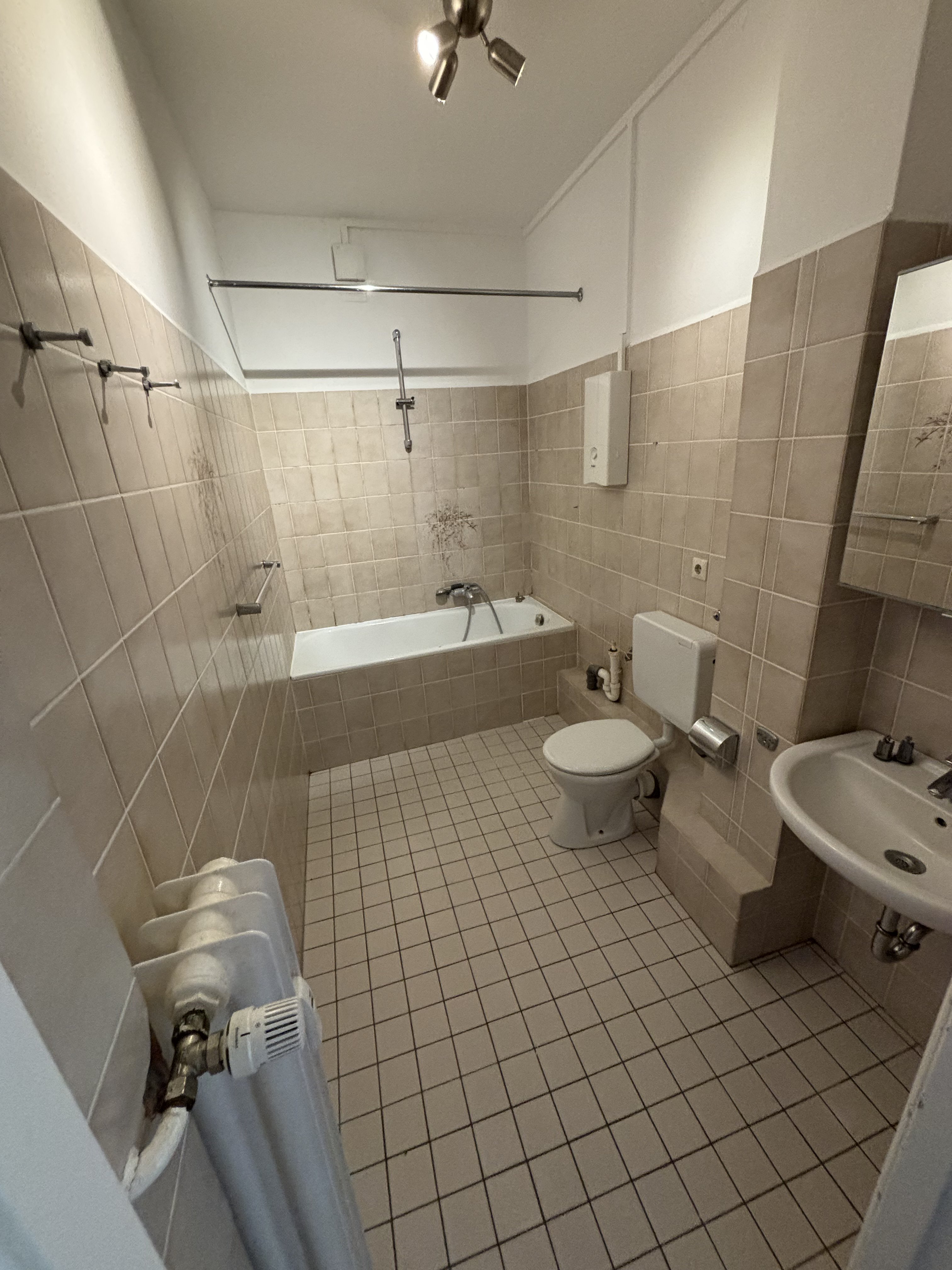Das Badezimmer liegt zwischen Wohn- und Schlafzimmer und verfügt über eine Badewanne.