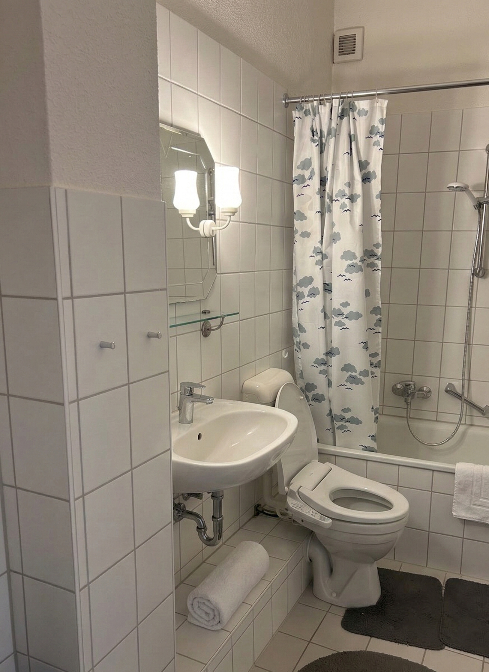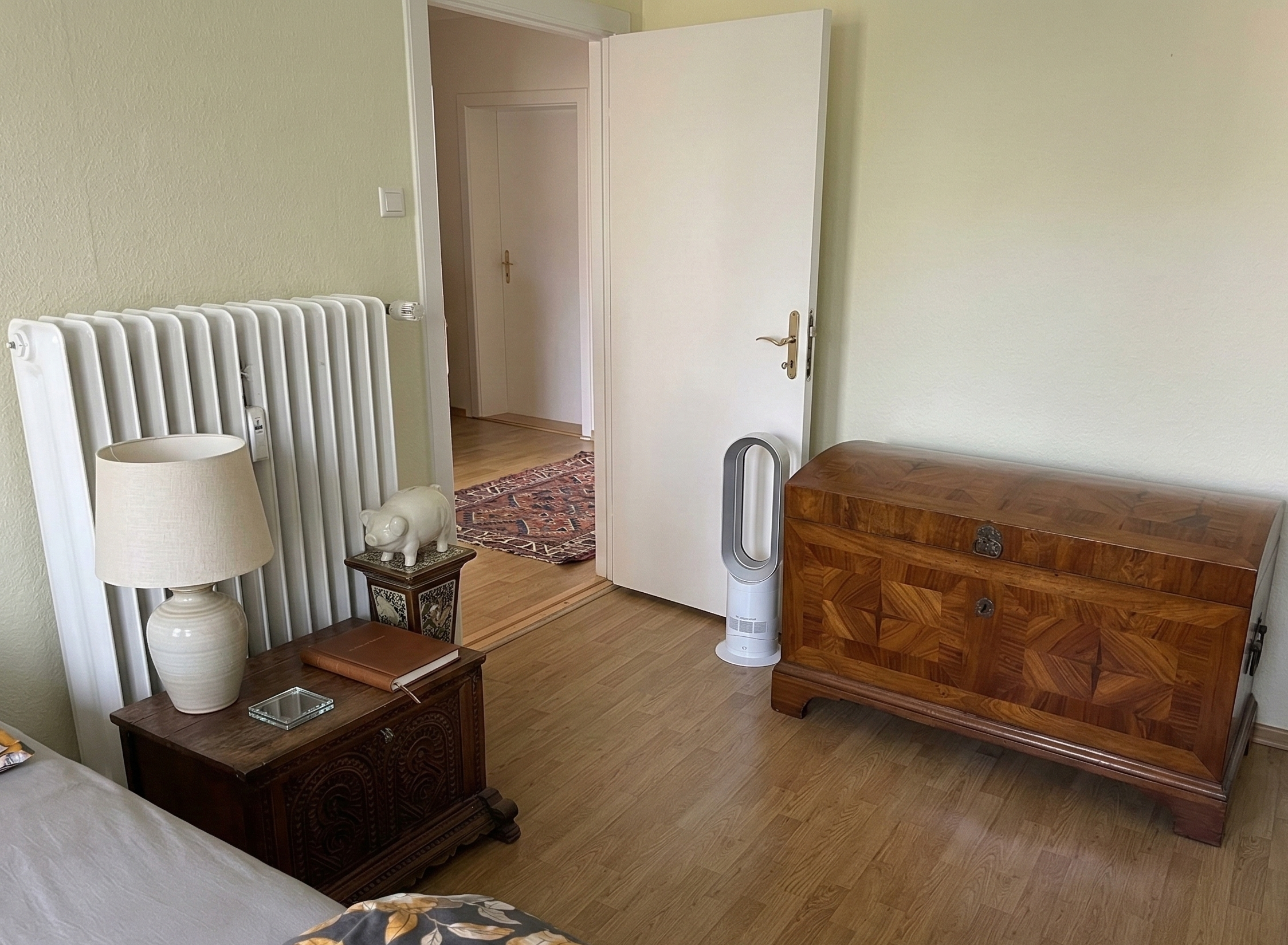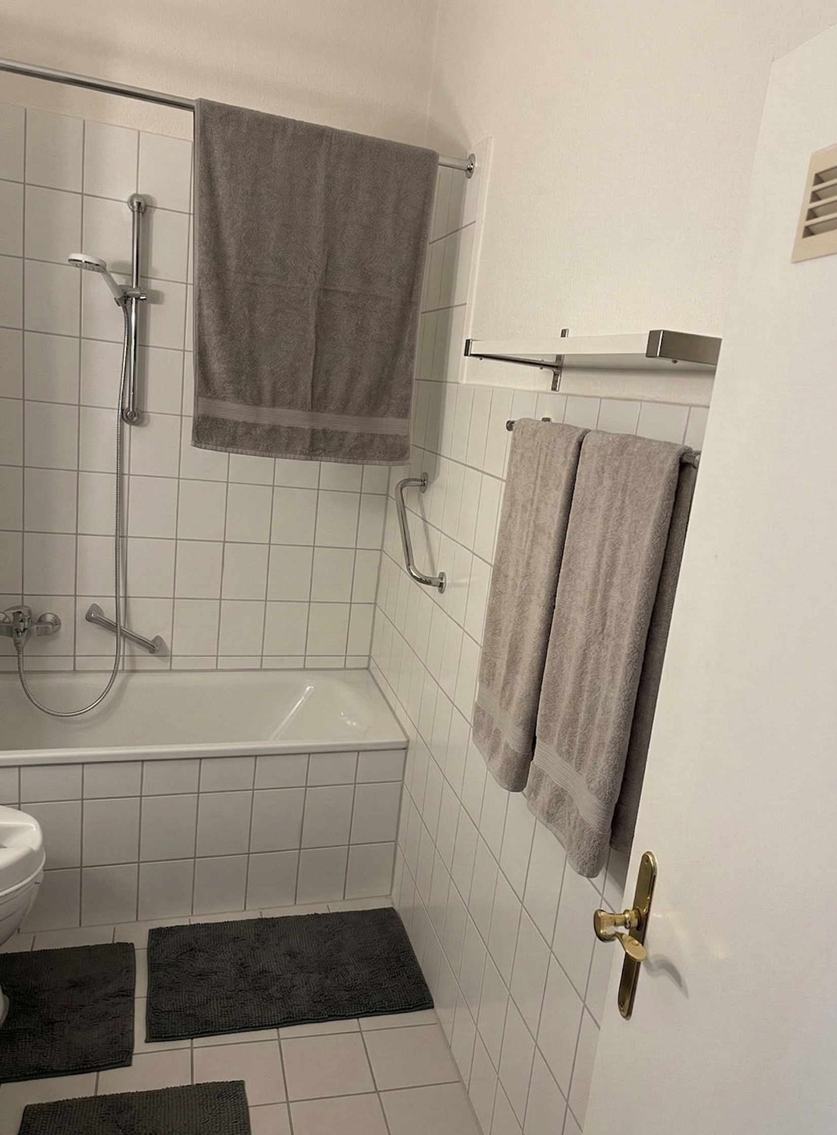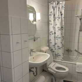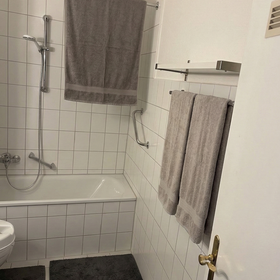 Das Badezimmer liegt zwischen Wohn- und Schlafzimmer und verfügt über eine Badewanne.