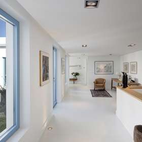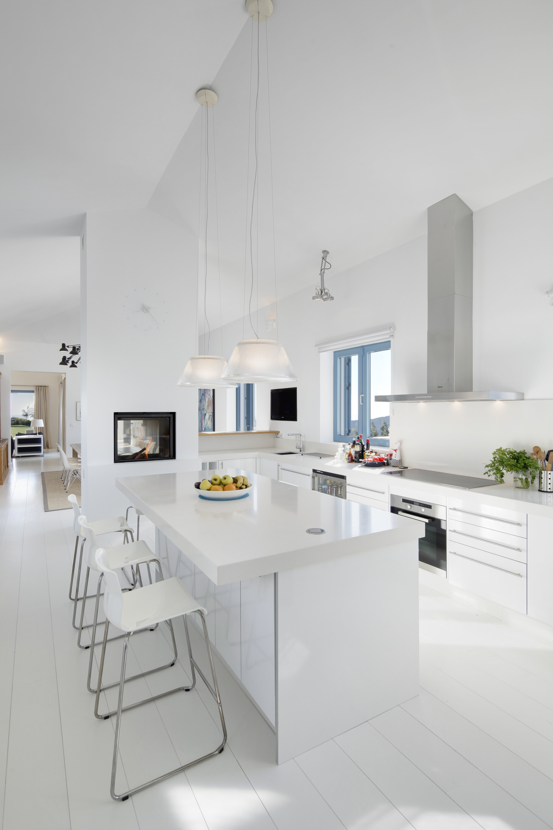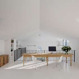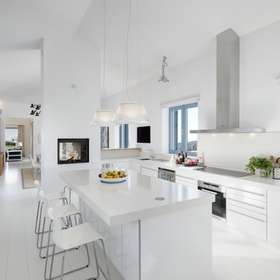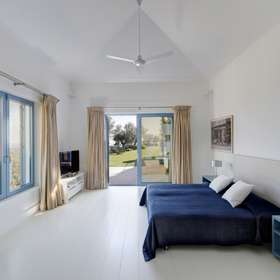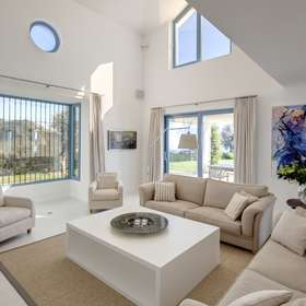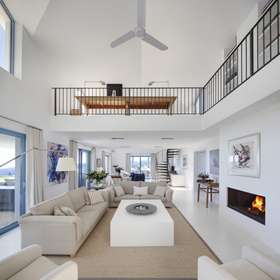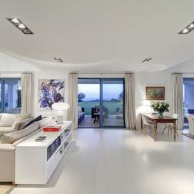 Im Erdgeschoss befindet sich ein geräumiges Wohnzimmer mit doppelter Raumhöhe und einem gemütlichen Kamin, ein separater Essbereich und eine voll ausgestattete offene Küche mit Siemens-, Miele- und Liebherr-Geräten. Auf der Zwischenebene gibt es Platz für ein Büro oder ein TV-Zimmer. Das Hauptschlafzimmer mit eigenem Bad und begehbarem Kleiderschrank befindet sich ebenfalls auf dieser Ebene. Darüber hinaus verfügt die Villa über zwei Gästezimmer mit eigenen Badezimmern sowie ein kleines Schlafzimmer neben der Küche, das sich ideal für das Personal eignet.