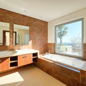 Im Erdgeschoss finden Sie einen einladenden Wohn- und Essbereich mit hohen Decken und einem Kamin, der direkten Zugang zum Garten und Poolbereich bietet. Die Küche ist komplett mit Bosch-Geräten ausgestattet, so dass die Zubereitung von Mahlzeiten ein Kinderspiel ist. Zwei Gästeschlafzimmer auf dieser Ebene teilen sich ein gut ausgestattetes Badezimmer, während ein Gäste-WC zusätzlichen Komfort bietet.