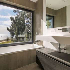 Es bietet einen Gemeinschaftspool mit überdachten Bereichen, Heizung und Klimatisierung. Zusätzlich gibt es eine Klimaanlage, Fußbodenheizung und einen gemütlichen Kamin. Das Haus bietet einen atemberaubenden Meerblick.
